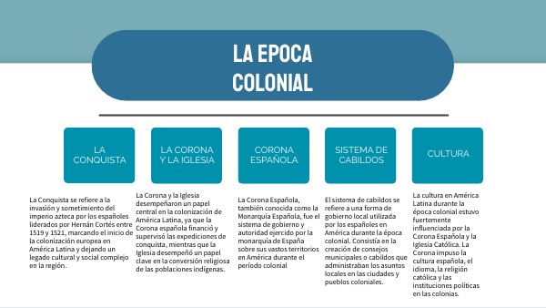La cultura en América Latina durante la época colonial estuvo fuertemente influenciada por la Corona Española y la Iglesia Católica. La Corona impuso la cultura española, el idioma, la religión católica y las instituciones políticas en las colonias.