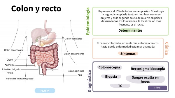 El colon es la parte más larga del intestino grueso (1,5 m) y se extiende entre el ciego y el recto. Es el encargado de extraer agua y algunos nutrientes y electrolitos de los alimentos parcialmente digeridos.Los restos no digeridos (heces) se mueven y se almacenan a través de este órgano hasta que salen al exterior por el ano. El recto es la continuación del colon hasta el ano. Mide unos 12-15 cm de longitud y está situado delante del sacro y cóccix y detrás de la vejiga y de la próstata (en el hombre) o la vagina (en la mujer).