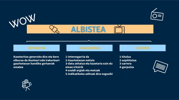 Kazetaritza-generoko dira eta bere elburua da ikusleari edo irakurleari gaurkotasun handiko gertaerak ematea