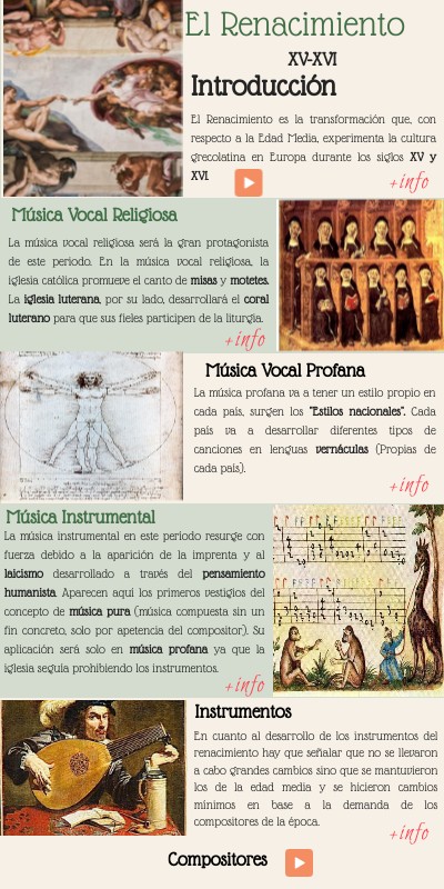 - En el Renacimiento triunfa la polifonía, en la que se desarrollará el contrapunto imitativo, a través del cual distintas voces realizan imitaciones entre ellas.