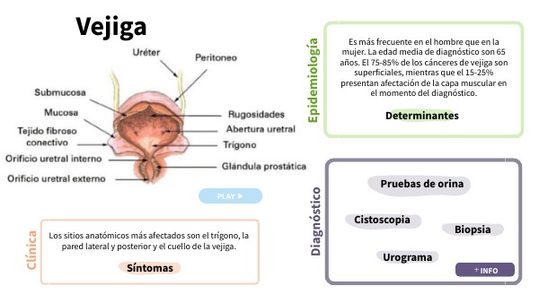 Es más frecuente en el hombre que en la mujer. La edad media de diagnóstico son 65 años. El 75-85% de los cánceres de vejiga son superficiales, mientras que el 15-25% presentan afectación de la capa muscular en el momento del diagnóstico.