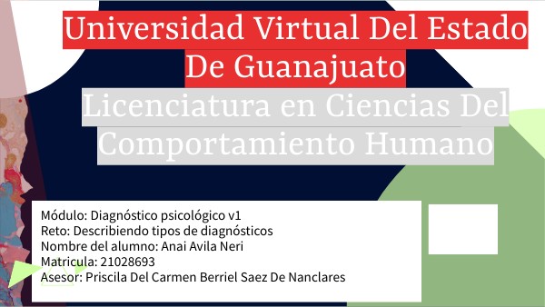 Módulo: Diagnóstico psicológico v1 Reto: Describiendo tipos de diagnósticos Nombre del alumno: Anai Avila Neri Matricula: 21028693 Asesor: Priscila Del Carmen Berriel Saez De Nanclares