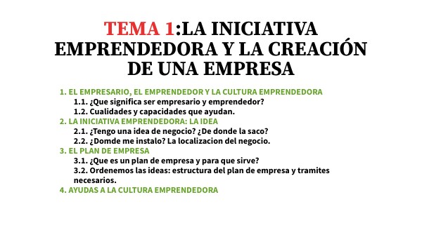 1. EL EMPRESARIO, EL EMPRENDEDOR Y LA CULTURA EMPRENDEDORA1.1. ¿Que significa ser empresario y emprendedor? 1.2. Cualidades y capacidades que ayudan.2. LA INICIATIVA EMPRENDEDORA: LA IDEA2.1. ¿Tengo una idea de negocio? ¿De donde la saco?2.2. ¿Domde me instalo? La localizacion del negocio.3. EL PLAN DE EMPRESA3.1. ¿Que es un plan de empresa y para que sirve?3.2. Ordenemos las ideas: estructura del plan de empresa y tramites necesarios.4. AYUDAS A LA CULTURA EMPRENDEDORA
