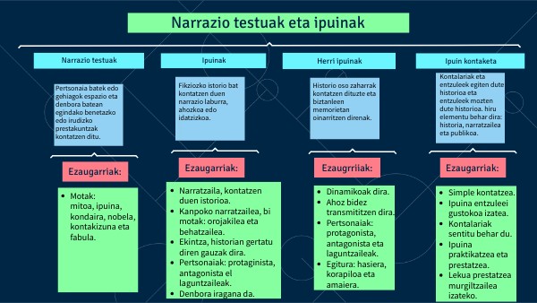 - Motak: mitoa, ipuina, kondaira, nobela, kontakizuna eta fabula.