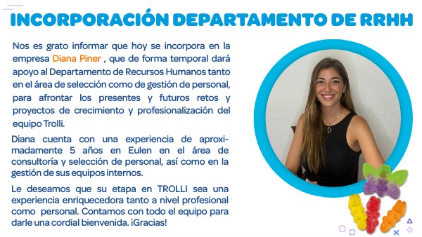 Nos es grato informar que hoy se incorpora en la empresa Diana Piner , que de forma temporal dará apoyo al Departamento de Recursos Humanos tanto en el área de selección como de gestión de personal, para afrontar los presentes y futuros retos y proyectos de crecimiento y profesionalización del equipo Trolli.