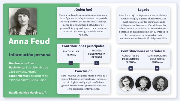 Nombre: Anna Freud Nacimiento: 3 de diciembre de 1895 en Viena, Austria Fallecimiento: 9 de octubre de 1982 en Londres, Reino Unido Natalia Garrido Martínez 1ºA