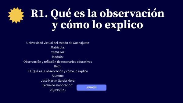 Universidad virtual del estado de Guanajuato Matricula: 23004147 Modulo: Observación y reflexión de escenarios educativos Reto: R1. Qué es la observación y cómo lo explico Alumno: José Martin García Mora Fecha de elaboración: 20/09/2023