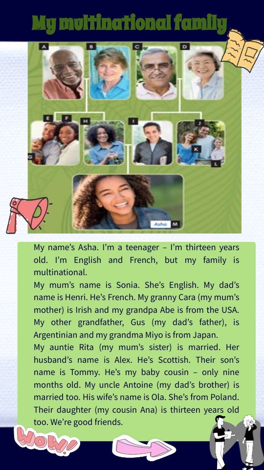 My name’s Asha. I’m a teenager – I’m thirteen years old. I’m English and French, but my family is multinational. My mum’s name is Sonia. She’s English. My dad’s name is Henri. He’s French. My granny Cara (my mum’s mother) is Irish and my grandpa Abe is from the USA. My other grandfather, Gus (my dad’s father), is Argentinian and my grandma Miyo is from Japan. My auntie Rita (my mum’s sister) is married. Her husband’s name is Alex. He’s Scottish. Their son’s name is Tommy. He’s my baby cousin – only nine months old. My uncle Antoine (my dad’s brother) is married too. His wife’s name is Ola. She’s from Poland. Their daughter (my cousin Ana) is thirteen years old too. We’re good friends.