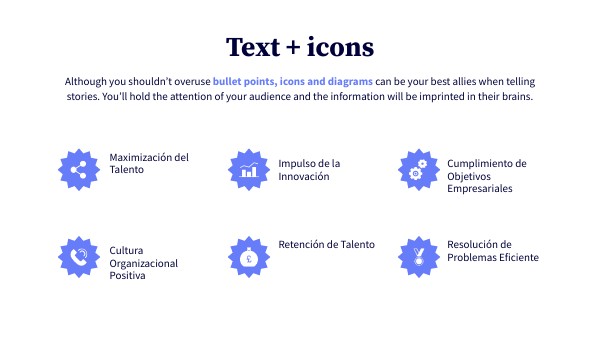 Although you shouldn’t overuse bullet points, icons and diagrams can be your best allies when telling stories. You’ll hold the attention of your audience and the information will be imprinted in their brains.