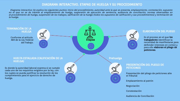 • Diagrama interactivo: Se explica los siguientes puntos: Inicio del procedimiento, autoridad ante la que se presenta, emplazamiento, contestación, supuesto en el que no se da trámite al emplazamiento de huelga, suspensión de ejecución de sentencia, audiencia de conciliación, normas observables en el procedimiento de huelga, suspensión de los trabajos, salificación de la huelga (todos los supuestos de calificación y sus procedimientos) y terminación de la huelga.