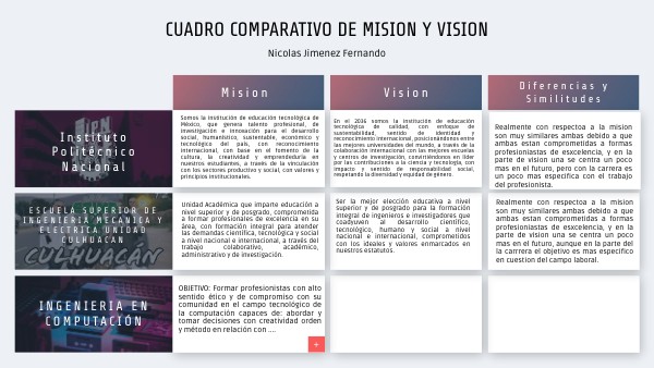 Realmente con respectoa a la mision son muy similares ambas debido a que ambas estan comprometidas a formas profesioniastas de esxcelencia, y en la parte de vision una se centra un poco mas en el futuro, aunque en la parte del la carrrera el objetivo es mas especifico en cuestion del campo laboral.