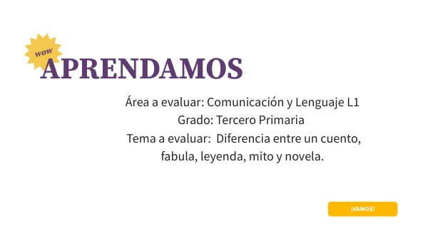 Área a evaluar: Comunicación y Lenguaje L1 Grado: Tercero Primaria Tema a evaluar: Diferencia entre un cuento, fabula, leyenda, mito y novela.