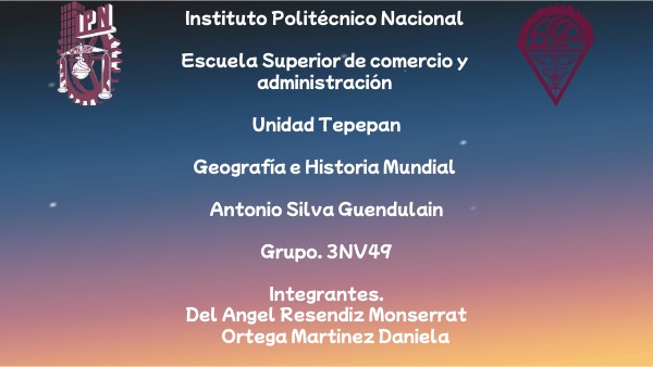 Instituto Politécnico Nacional Escuela Superior de comercio y administración Unidad Tepepan Geografía e Historia Mundial Antonio Silva Guendulain Grupo. 3NV49 Integrantes. Del Angel Resendiz MonserratOrtega Martinez Daniela
