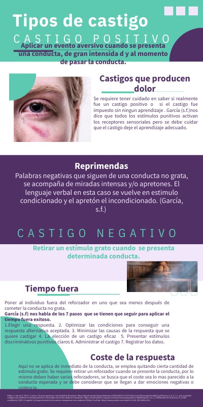 Bados, A. García, E. (2011, 11 junio). Técnicas operantes. Universidad de Barcelona. https://diposit.ub.edu/dspace/bitstream/2445/18402/1/T%C3%A9cnicas%20operantes%202011.pdf García, O. (s. f.). L7. ¿Aún es debido castigar para modificar el comportamiento? Universidad virtual des estado de Guanajuato. https://avalicmod19c.uveg.edu.mx/mod/scorm/player.php?a=4988¤torg=MC_U2_L7_ORG&scoid=10718 García, O., [UVEG académico]. (2022, 11 agosto). ¿Se logra disminuir la frecuencia o desaparecer una conducta? [Vídeo]. YouTube. https://www.youtube.com/watch?v=L9rZ_M2-0yE&t=222s