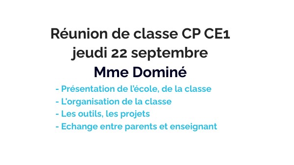 Réunion de classe CP CE1 jeudi 21 septembre Mme Dominé
