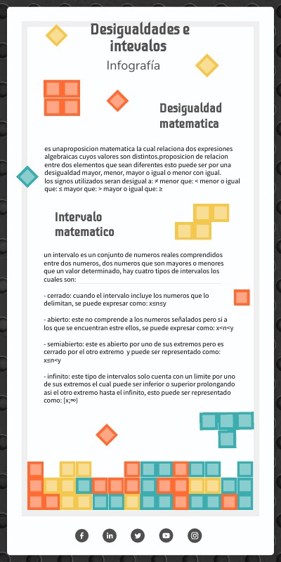 un intervalo es un conjunto de numeros reales comprendidos entre dos numeros, dos numeros que son mayores o menores que un valor determinado, hay cuatro tipos de intervalos los cuales son: - cerrado: cuando el intervalo incluye los numeros que lo delimitan, se puede expresar como: x≤n≤y - abierto: este no comprende a los numeros señalados pero si a los que se encuentran estre ellos, se puede expresar como: x<n<y - semiabierto: este es abierto por uno de sus extremos pero es cerrado por el otro extremo y puede ser representado como: x≤n<y - infinito: este tipo de intervalos solo cuenta con un limite por uno de sus extremos el cual puede ser inferior o superior prolongando asi el otro extremo hasta el infinito, esto puede ser representado como: [x;∞)
