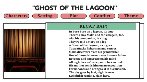 In Bora Bora on a lagoon, its trueTheres a boy Mako and the villagers, too. Afa, his companion, is a dog They're told a story on a log A Ghost of the Lagoon, as it goes Tupa attacks fisherman and canoes. Mako discovers from his grandfather One of those fisherman was his own father. Revenge and anger are on his mind All night he can't sleep until he can find. His mother sends him on an expedition For bananas and oranges, it is his mission. The day goes by fast, night is near Lets finish reading, right here.