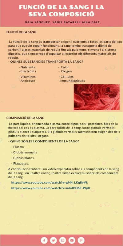 La part líquida, anomenada plasma, conté aigua, sals i proteïnes. Més de la meitat del cos és plasma. La part sòlida de la sang conté glòbuls vermells, glòbuls blancs i plaquetes. Els glòbuls vermells subministren oxigen des dels pulmons als teixits i òrgans.- QUINS SÓN ELS COMPONENTS DE LA SANG? - Plasma - Globús vermells - Globús blancs - Plaquetes. A continuació trobareu un video explicatiu sobre els components de la sang de la sang i en unaltre enllaç unaltre video explicatiu sobre els components de la sang. https://www.youtube.com/watch?v=gM4_LKq8vVk https://www.youtube.com/watch?v=mG4PO6E-Wp0