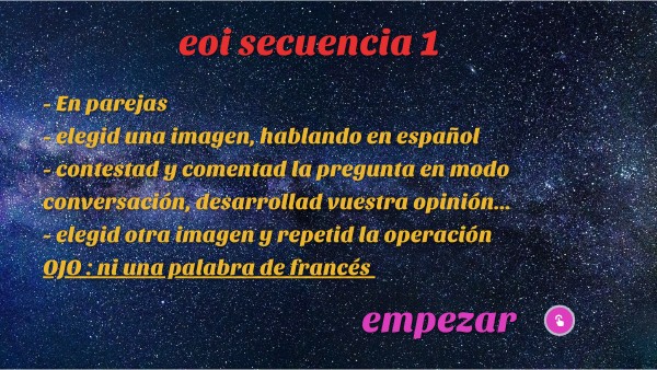 - En parejas- elegid una imagen, hablando en español - contestad y comentad la pregunta en modo conversación, desarrollad vuestra opinión... - elegid otra imagen y repetid la operación OJO : ni una palabra de francés