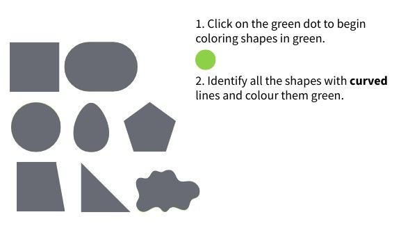 1. Click on the green dot to begin coloring shapes in green. 2. Identify all the shapes with curved lines and colour them green.