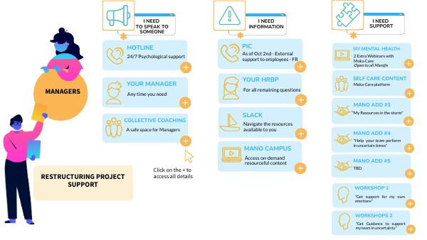 A self space for Managers, powered by Moka Care, to alleviate the weight of your role. First dates as of last week of September for managers of Spanish team members, within 2 weeks for all managers. Option to choose from the offers "collective coaching", "workshop 1 - get support for my own emotions" and "workshop 2 - get guidance to support my team in uncertainty".