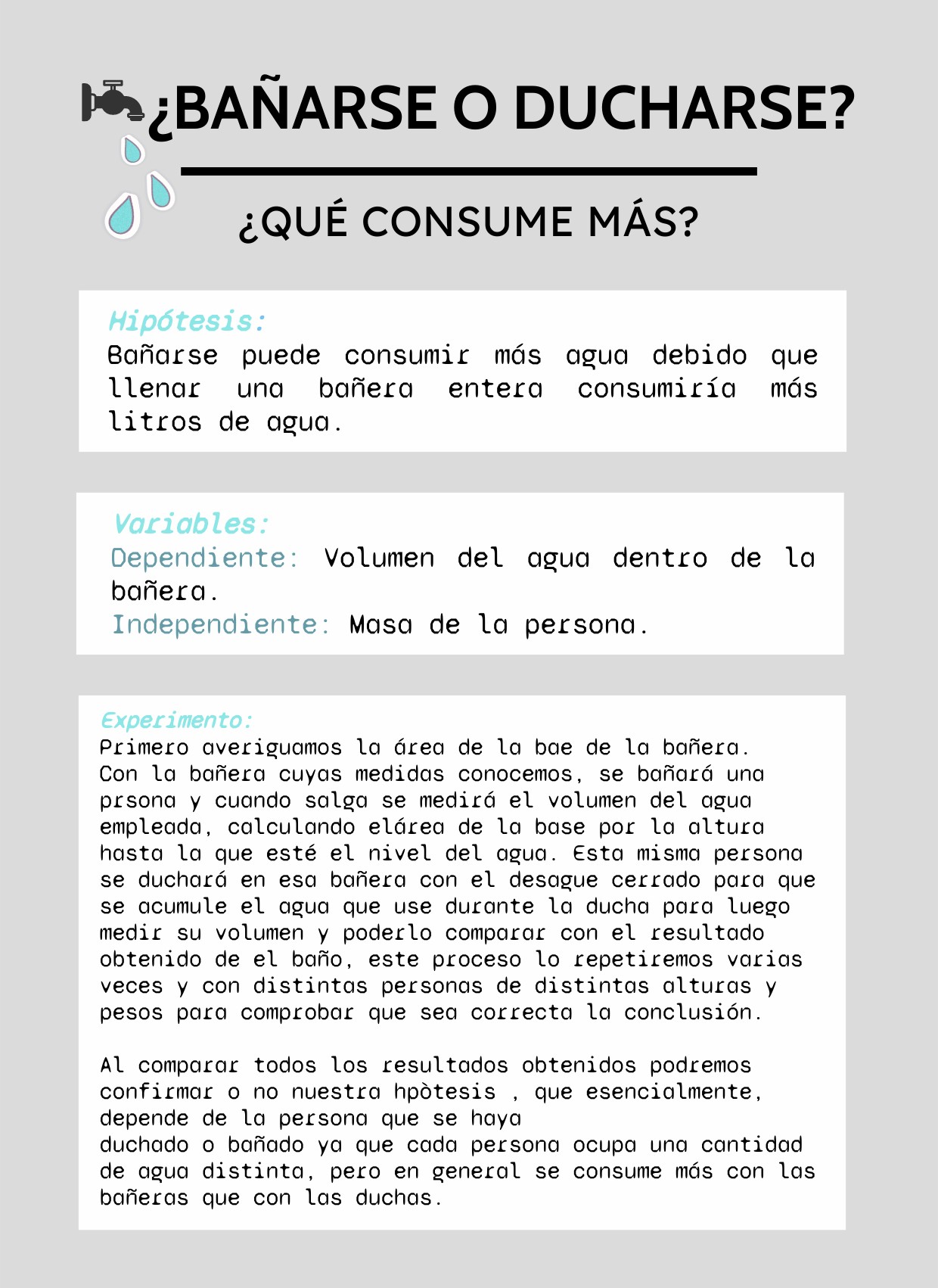 Experimento: Primero averiguamos la área de la bae de la bañera. Con la bañera cuyas medidas conocemos, se bañará una prsona y cuando salga se medirá el volumen del agua empleada, calculando elárea de la base por la altura hasta la que esté el nivel del agua. Esta misma persona se duchará en esa bañera con el desague cerrado para que se acumule el agua que use durante la ducha para luego medir su volumen y poderlo comparar con el resultado obtenido de el baño, este proceso lo repetiremos varias veces y con distintas personas de distintas alturas y pesos para comprobar que sea correcta la conclusión. Al comparar todos los resultados obtenidos podremos confirmar o no nuestra hpòtesis , que esencialmente, depende de la persona que se haya duchado o bañado ya que cada persona ocupa una cantidad de agua distinta, pero en general se consume más con las bañeras que con las duchas.