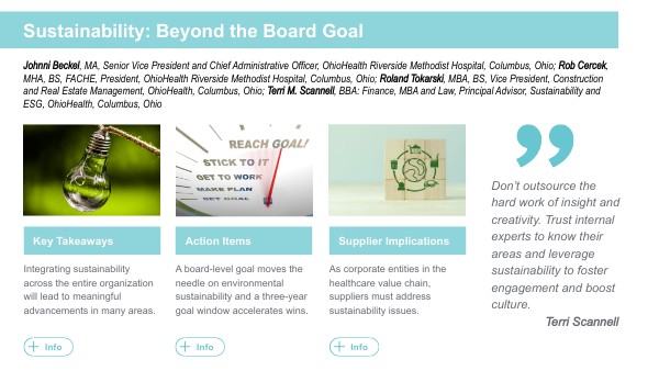Johnni Beckel, MA, Senior Vice President and Chief Administrative Officer, OhioHealth Riverside Methodist Hospital, Columbus, Ohio; Rob Cercek, MHA, BS, FACHE, President, OhioHealth Riverside Methodist Hospital, Columbus, Ohio; Roland Tokarski, MBA, BS, Vice President, Construction and Real Estate Management, OhioHealth, Columbus, Ohio; Terri M. Scannell, BBA: Finance, MBA and Law, Principal Advisor, Sustainability and ESG, OhioHealth, Columbus, Ohio