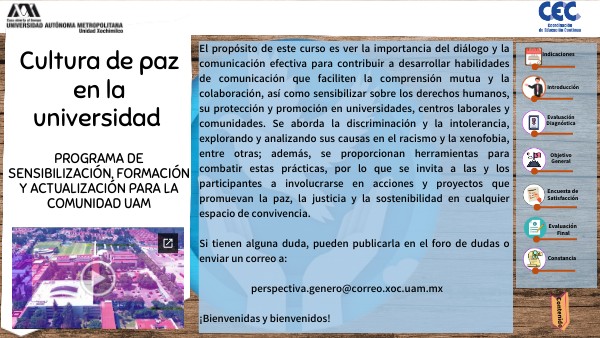 El propósito de este curso es ver la importancia del diálogo y la comunicación efectiva para contribuir a desarrollar habilidades de comunicación que faciliten la comprensión mutua y la colaboración, así como sensibilizar sobre los derechos humanos, su protección y promoción en universidades, centros laborales y comunidades. Se aborda la discriminación y la intolerancia, explorando y analizando sus causas en el racismo y la xenofobia, entre otras; además, se proporcionan herramientas para combatir estas prácticas, por lo que se invita a las y los participantes a involucrarse en acciones y proyectos que promuevan la paz, la justicia y la sostenibilidad en cualquier espacio de convivencia. Si tienen alguna duda, pueden publicarla en el foro de dudas o enviar un correo a: perspectiva.genero@correo.xoc.uam.mx ¡Bienvenidas y bienvenidos!