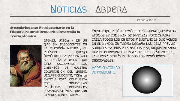 Atenas, Grecia - En un giro sin precedentes en la filosofía natural, el filósofo griego Demócrito ha presentado su teoría atómica, que está sacudiendo los cimientos de nuestra comprensión del mundo. Según Demócrito, toda la materia está compuesta por minúsculas partículas indivisibles llamadas átomos, que son eternos e inmutables.