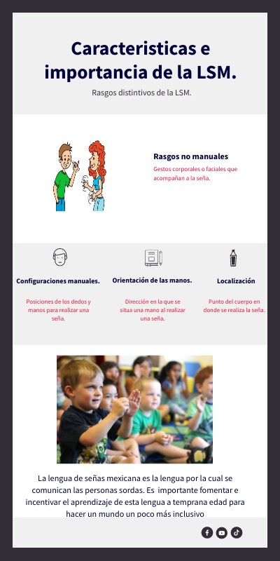 La lengua de señas mexicana es la lengua por la cual se comunican las personas sordas. Es importante fomentar e incentivar el aprendizaje de esta lengua a temprana edad para hacer un mundo un poco más inclusivo