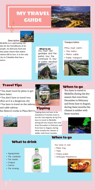 • You must travel by plane to get there faster • You don't have to travel very often as it is a dangerous city • You have to travel on the subway and cable subway See Botero's works in Plaza Botero