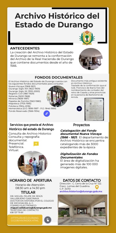 Dirección : C. Cerro de la Cruz N° 122.Fracc. Lomas del Guadina. C.P. 34110 archivo.historico@durango.gob.mx