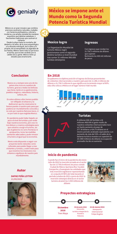 Mexico es y siempre sera uno de los paises mas ricos en cuestion de turismo, gracias a todas las bellezas que tiene, tanto en su gastronomia, pueblos magicos, naturaleza, historia, cultura, etc. En estos ultimos años hemos podido ver reflejado el esfuerzo y la dedicacion que los mexicanos le hemos puesto a nuestro pais para que pudiera ser mundialmente conocido y no solo por nuestros famosos tacos, si no por todo lo que engloba Mexico. En pandemia pudo haber bajado un poco el nivel de turistas y por ende bajo nuestra economia, pero eso no nos detuvo y creamos estrategias para que volviera a surgir el turismo, asi que el gobierno no cerro fronteras ni aeropuertos, tomo las medidas sanitarias adecuadas y pudo renacer el turismo al igual que la economia. Mexico esta dispuesto a seguir con proyectos tanto naturales como culturales para poder llegar a mas visitantes y turistas, y sobre todo para que nosotros los mexicanos nos sintamos orgullosos de nuestro pais mundialmente.