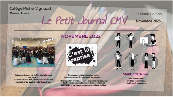 Merci à tous ceux qui ont participé à la première édition 2023/2024 du Petit Journal CMV. Prochaine édition en janvier N'hésitez pas à venir nous voir pour toutes suggestions et idées à paraître dans le journal.