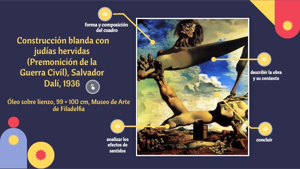 Elegimos este cuadro de Dalí porque desde la primera vez que lo vimos inmediatamente nos sorprendió ver la representación de un cuerpo desmembrado que predomina en la obra. De hecho, el cartel es sorprendente e incluso impactante. Finalmente, elegimos este cuardo porque se puede interpretar de varias maneras diferentes, lo cual es muy interesante.