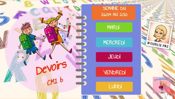 Tu trouveras dans cette agenda tous les devoirs de la semaine, du mardi au lundi de la semaine suivante.
