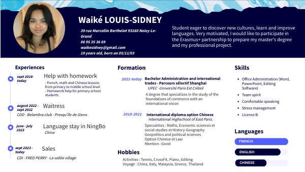 39 rue Marcellin Berthelot 93160 Noisy-Le-Grand 06 95 35 36 69 waikesidney@gmail.com 19 years old, born on 05/11/03