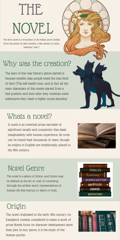 The novel originated in the early 18th century on Eangland, novelas considered to mean a work of prose Novels focus on character development more than plot. In any genre, it is the study of the human psyche.