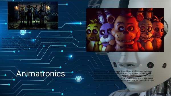 Animatronics se refiere al uso de dispositivos de cable tirado o motores para emular a un ser humano o un animal, o para traer características reales a un objeto inanimado. Animatronics se introdujo por primera vez por Disney en 1962 para la película Mary Poppins que presentaba un ave animatrónica. Esto fue controlado completamente por cables de bicicleta.