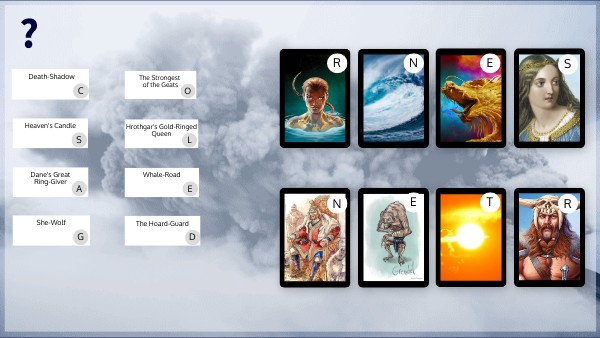 Drag the kenning or epithet to the image it describes. The letter listed in each kenning/epithet, followed by the letter listed in each image, will spell out a clue. The answer to that clue is the lock code.