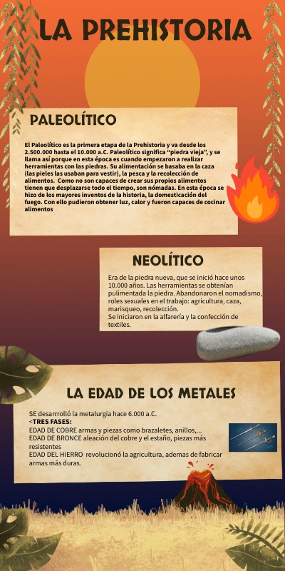 El Paleolítico es la primera etapa de la Prehistoria y va desde los 2.500.000 hasta el 10.000 a.C. Paleolítico significa “piedra vieja”, y se llama así porque en esta época es cuando empezaron a realizar herramientas con las piedras. Su alimentación se basaba en la caza (las pieles las usaban para vestir), la pesca y la recolección de alimentos. Como no son capaces de crear sus propios alimentos tienen que desplazarse todo el tiempo, son nómadas. En esta época se hizo de los mayores inventos de la historia, la domesticación del fuego. Con ello pudieron obtener luz, calor y fueron capaces de cocinar alimentos