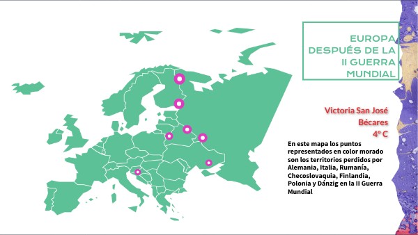 En este mapa los puntos representados en color morado son los territorios perdidos por Alemania, Italia, Rumanía, Checoslovaquia, Finlandia, Polonia y Dánzig en la II Guerra Mundial