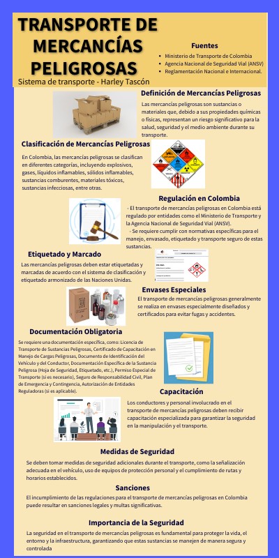 - El transporte de mercancías peligrosas en Colombia está regulado por entidades como el Ministerio de Transporte y la Agencia Nacional de Seguridad Vial (ANSV).