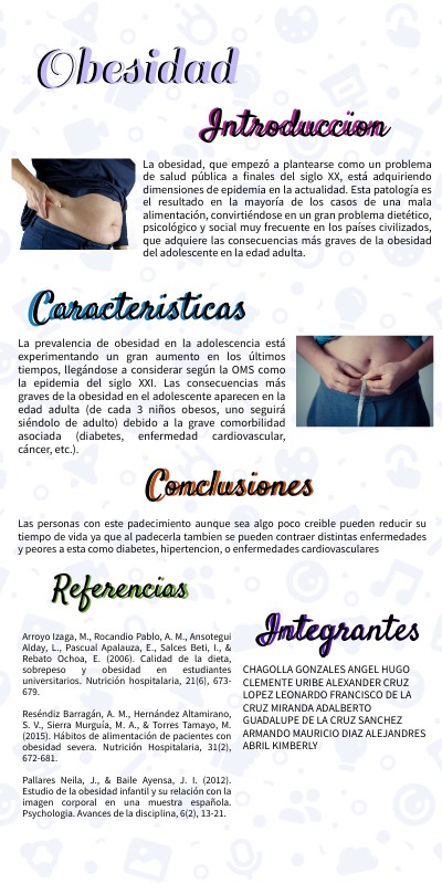 Arroyo Izaga, M., Rocandio Pablo, A. M., Ansotegui Alday, L., Pascual Apalauza, E., Salces Beti, I., & Rebato Ochoa, E. (2006). Calidad de la dieta, sobrepeso y obesidad en estudiantes universitarios. Nutrición hospitalaria, 21(6), 673-679. Reséndiz Barragán, A. M., Hernández Altamirano, S. V., Sierra Murguía, M. A., & Torres Tamayo, M. (2015). Hábitos de alimentación de pacientes con obesidad severa. Nutrición Hospitalaria, 31(2), 672-681. Pallares Neila, J., & Baile Ayensa, J. I. (2012). Estudio de la obesidad infantil y su relación con la imagen corporal en una muestra española. Psychologia. Avances de la disciplina, 6(2), 13-21.