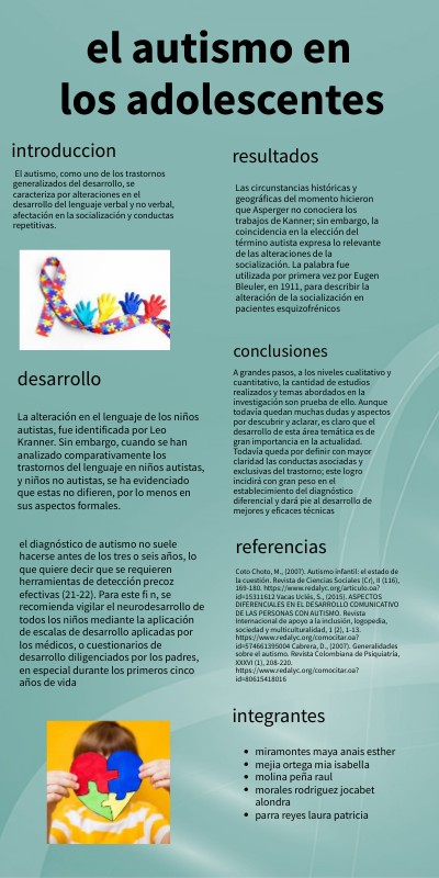 Coto Choto, M., (2007). Autismo infantil: el estado de la cuestión. Revista de Ciencias Sociales (Cr), II (116), 169-180. https://www.redalyc.org/articulo.oa?id=15311612 Vacas Uclés, S., (2015). ASPECTOS DIFERENCIALES EN EL DESARROLLO COMUNICATIVO DE LAS PERSONAS CON AUTISMO. Revista Internacional de apoyo a la inclusión, logopedia, sociedad y multiculturalidad, 1 (2), 1-13. https://www.redalyc.org/comocitar.oa?id=574661395004 Cabrera, D., (2007). Generalidades sobre el autismo. Revista Colombiana de Psiquiatría, XXXVI (1), 208-220. https://www.redalyc.org/comocitar.oa?id=80615418016