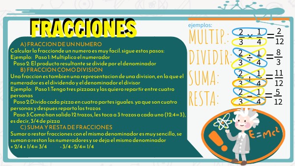 A) FRACCION DE UN NUMEROCalcular la fraccionde un numero es muy facil. sigue estos pasos:Ejemplo: Paso 1: Multiplico el numerador Paso 2: El producto resultante se divide por el denominadorB) FRACCION COMO DIVISIONUna fraccion es tambien una representacion de una division, en la que el numerador es el dividendo y el denominador el divisor Ejemplo: Paso 1:Tengo tres pizzaas y las quiero repartir entre cuatro personas Paso 2:Divido cada pizza en cuatro partes iguales. ya que son cuatro personas y despues reparto los trozos Paso 3:Como han salido 12 trozos, les toca a 3 trozos a cada uno (12:4=3), es decir, 3/4 de pizzaC) SUMA Y RESTA DE FRACCIONESSumar o restar fracciones con el mismo denominador es muy sencillo, se suman o restan los numeradores y se deja el mismo denominador+ 2/4 + 1/4= 3/4 - 3/4 - 2/4= 1/4