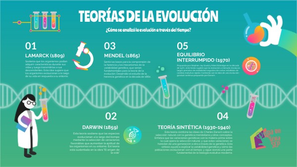 En la presente línea de tiempo se presentan 5 teorías sobre la evolución desarrolladas en los siglos XIX y XX; con su principal información.