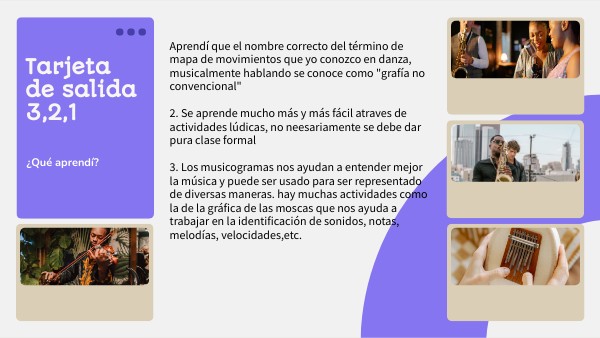 Aprendí que el nombre correcto del término de mapa de movimientos que yo conozco en danza, musicalmente hablando se conoce como "grafía no convencional" 2. Se aprende mucho más y más fácil atraves de actividades lúdicas, no neesariamente se debe dar pura clase formal 3. Los musicogramas nos ayudan a entender mejor la música y puede ser usado para ser representado de diversas maneras. hay muchas actividades como la de la gráfica de las moscas que nos ayuda a trabajar en la identificación de sonidos, notas, melodías, velocidades,etc.