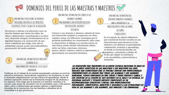 La educación que queremos en la Nueva Escuela Mexicana se basa en las mejores prácticas de las maestras y los maestros del país, quienes han demostrado que es posible contar con profesionales comprometidos en lograr que todas las alumnas y los alumnos aprendan, tienen confianza en que todas y todos pueden y saben, y los colocan en el centro de sus acciones en el aula y la escuela. Es personal docente y técnico docente consciente de su responsabilidad educativa y social; son profesionistas preparados, competentes, honestos y sensibles a las situaciones de vida de las alumnas y los alumnos, sus familias y su comunidad.