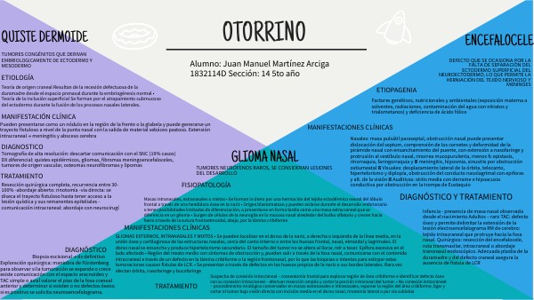 Masas intranasales, extranasales o mixtas • Se forman in útero por una herniación del tejido ectodérmico neural del lóbulo frontal a través de una hendidura ósea en la nariz • Origen blastomatoso y pueden aislarse durante el desarrollo embrionario o tener posibilidades limitadas de diferenciación, o presentarse en forma tardía como una masa extracraneal que se diferencia en un glioma • Surgen de células de la neuroglia en la mucosa nasal alrededor del bulbo olfatorio y crecen hacia fuera a través de la sutura frontoetmoidal, abajo, por la lámina cribiforme